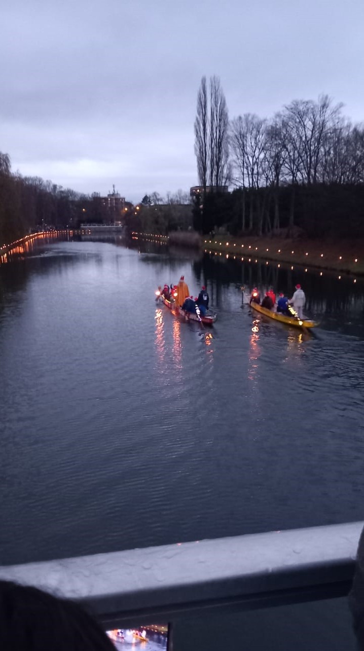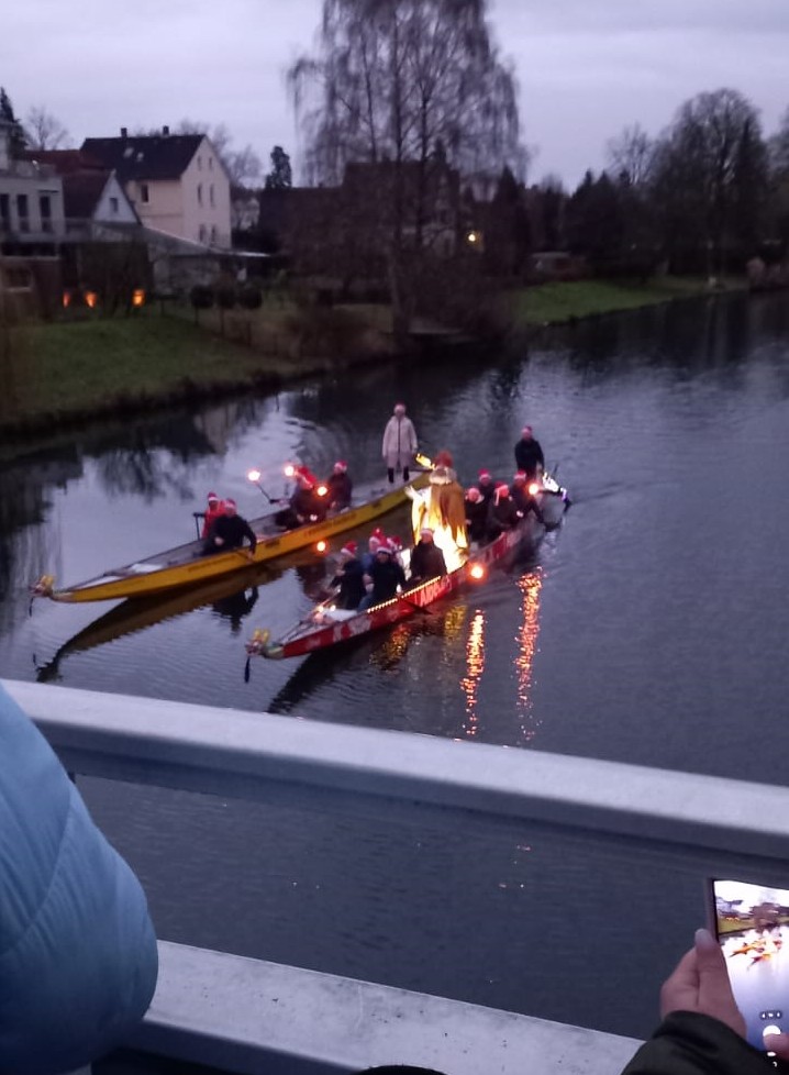 Auf einem Drachenboot stehend und von ein paar Einzelpaddler mit Kindern und einem weiteren Drachenboot wurde der Nikolaus vom Bootshaus des Herforder Kanu Klub e. V. zum Bergertorwehr gebracht. Dort wurde er von einer großen Zahl wartender Kinder empfangen.